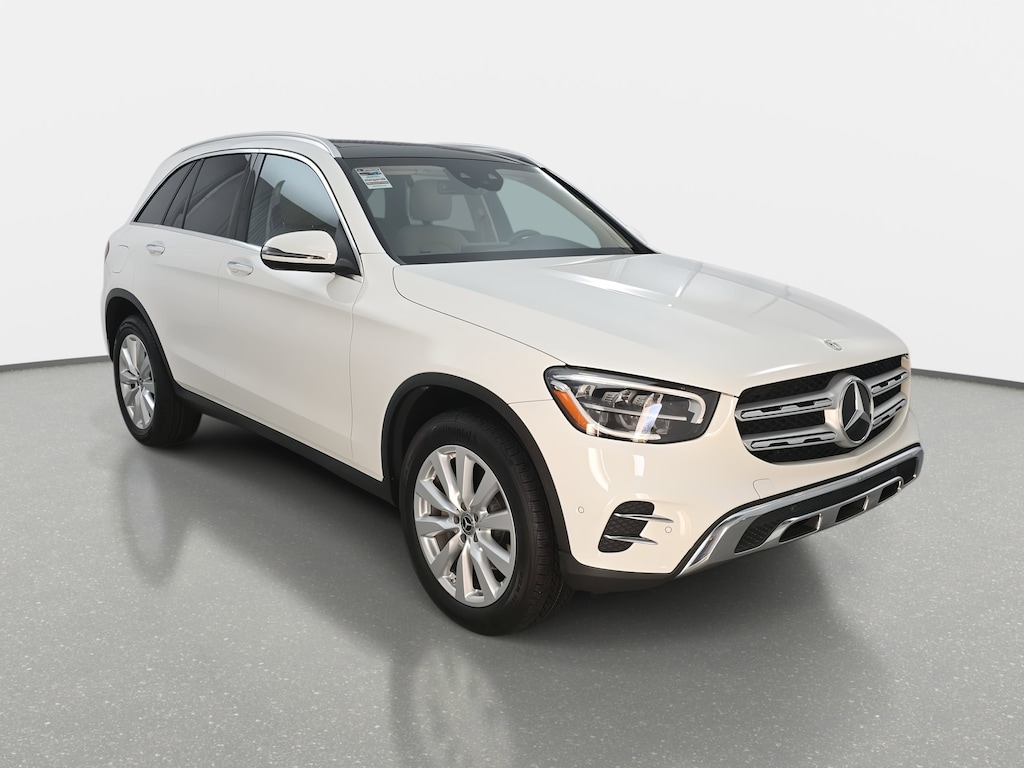 Certified. White 2021 Mercedes-Benz GLC GLC 300 4MATIC® I4 10.25" Center Touchscreen Display, 4-Way Lumbar Support, 4-Wheel Disc Brakes, 6 Speakers, ABS brakes, Air Conditioning, AM/FM radio, Apple CarPlay®/Android Auto®, Augmented Video for Navigation, Auto tilt-away steering wheel, Auto-dimming door mirrors, Auto-dimming Rear-View mirror, Automatic temperature control, Brake assist, Bumpers: body-color, Child-Seat-Sensing Airbag, Delay-off headlights, Driver door bin, Driver vanity mirror, Dual front impact airbags, Dual front side impact airbags, Electronic Stability Control, Emergency communication system: eCall Emergency System, Exterior Parking Camera Rear, Four wheel independent suspension, Front anti-roll bar, Front Bucket Seats, Front Center Armrest, Front dual zone A/C, Front reading lights, Fully automatic headlights, Garage door transmitter: HomeLink, Genuine wood dashboard insert, Heated door mirrors, Heated Front Bucket Seats, Heated front seats, Heated Steering Wheel, Illuminated entry, Knee airbag, Leather steering wheel, Low tire pressure warning, MB Hard-Disc Navigation w/Live Traffic, MB-Tex Upholstery, Memory seat, Multimedia Package, Navigation Services, Occupant sensing airbag, Outside temperature display, Overhead airbag, Overhead console, Panic alarm, Panorama Sunroof, Passenger door bin, Passenger vanity mirror, Power door mirrors, Power driver seat, Power Front Seat w/Driver Memory, Power Liftgate, Power passenger seat, Power steering, Power windows, Radio data system, Radio: MBUX Multimedia System, Radio: MBUX Premium Multimedia System, Rear anti-roll bar, Rear fog lights, Rear reading lights, Rear seat center armrest, Rear window defroster, Remote keyless entry, Roof rack: rails only, Security system, Speed control, Speed-sensing steering, Split folding rear seat, Spoiler, Steering wheel memory, Steering wheel mounted audio controls, Tachometer, Telescoping steering wheel, Tilt steering wheel, Traction control, Trip computer, Turn signal indicator mirrors, Wheels: 8J x 19 ET 38 10-Spoke.