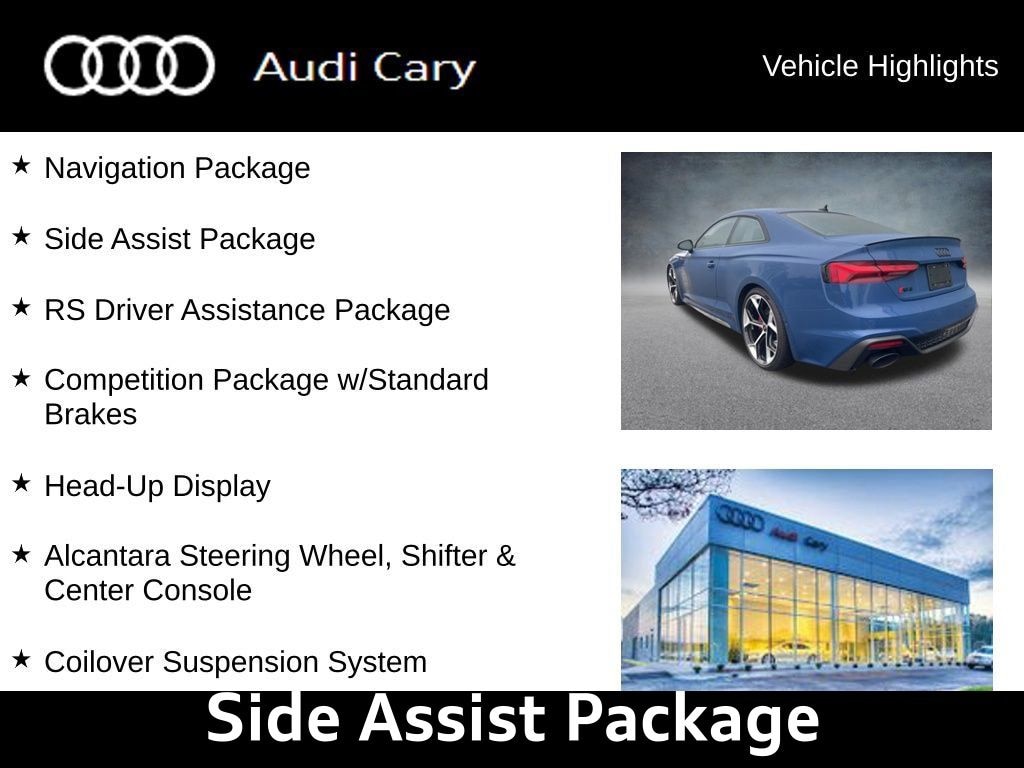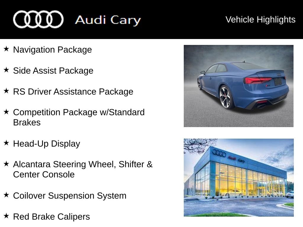 Ascari Blue Metallic 2023 Audi RS 5 2.9T quattro 8-Speed Automatic with Tiptronic 2.9L V6 Turbocharged DOHC 24V LEV3-ULEV70 444hp quattro CARFAX One-Owner. Clean CARFAX. 180 mph Top Track Speed, Adaptive Cruise Control w/Traffic Jam Assist, Alcantara Steering Wheel, Shifter & Center Console, Audi Active Lane Assist, Audi Connect PLUS, Audi Pre-Sense Rear, Audi Side Assist, Coilover Suspension System, Competition Package w/Standard Brakes, Hands-On Detection Steering Wheel, Head-Up Display, Matte Alu Optic Exterior Mirror Housing, Matte Carbon Exterior Mirror Housings, MMI Navigation Plus, Navigation Package, Park Assist, Pearl Nappa/Dinamica Seating Surfaces, Red Brake Calipers, RS Driver Assistance Package, RS Logo Floor Mats w/Red Edging, RS Sport Exhaust System, Seat Belts w/Red Edging, Side Assist Package, Sport Direct Steering, Top View Camera System, Traffic Sign Recognition, Wheels: 20" 5-Y-Spoke Milled-Cut Design.