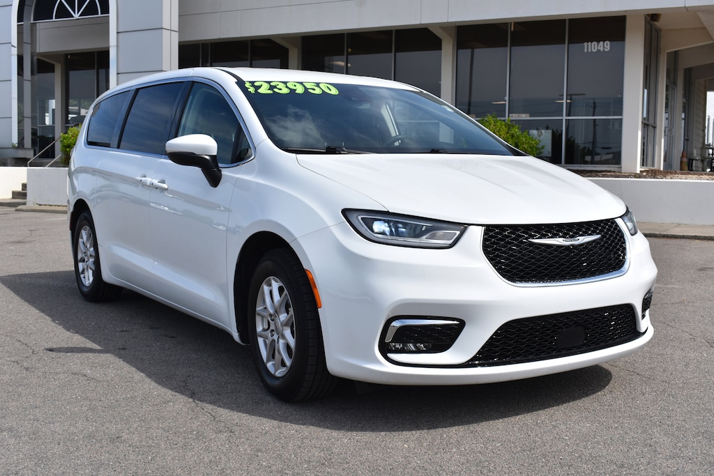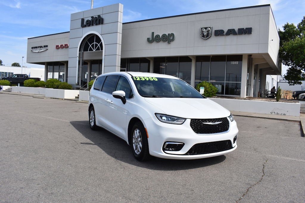 CARFAX One-Owner. Bright White Clearcoat 2023 Chrysler Pacifica Touring L FWD 9-Speed 948TE Automatic 3.6L V6 24V VVT 10.1" Touchscreen Display, 17" x 7.0" Aluminum Wheels, 3.25 Axle Ratio, 3rd row seats: split-bench, 4-Wheel Disc Brakes, 6 Speakers, ABS brakes, Air Conditioning, Alloy wheels, AM/FM radio: SiriusXM, Apple CarPlay, Apple CarPlay/Android Auto, Audio memory, Automatic temperature control, Black Seats, Brake assist, Bumpers: body-color, Caprice Leatherette Bucket Seats, Compass, Delay-off headlights, Disassociated Touchscreen Display, Driver's Seat Mounted Armrest, Dual front impact airbags, Dual front side impact airbags, Electronic Stability Control, Four wheel independent suspension, Front anti-roll bar, Front dual zone A/C, Front Fascia Air Deflectors, Front fog lights, Fully automatic headlights, Google Android Auto, GPS Antenna Input, Heated door mirrors, Heated front seats, Heated steering wheel, Illuminated entry, Integrated Active Noise Cancellation, Integrated Center Stack Radio, Knee airbag, Low tire pressure warning, Memory seat, Occupant sensing airbag, Outside temperature display, Overhead airbag, Panic alarm, ParkView Rear Back-Up Camera, Passenger door bin, Passenger seat mounted armrest, Passenger vanity mirror, Power door mirrors, Power driver seat, Power Liftgate, Power steering, Power windows, Quick Order Package 27L, Radio data system, Radio: Uconnect 5 w/10.1" Display, Rain sensing wipers, Rear air conditioning, Rear window defroster, Rear window wiper, Reclining 3rd row seat, Remote keyless entry, Security system, Speed control, Split folding rear seat, Spoiler, Steering wheel mounted audio controls, Tachometer, Telescoping steering wheel, Tilt steering wheel, Touring Suspension, Traction control, Trip computer, Turn signal indicator mirrors, USB Host Flip, Variably intermittent wipers, Voltmeter.