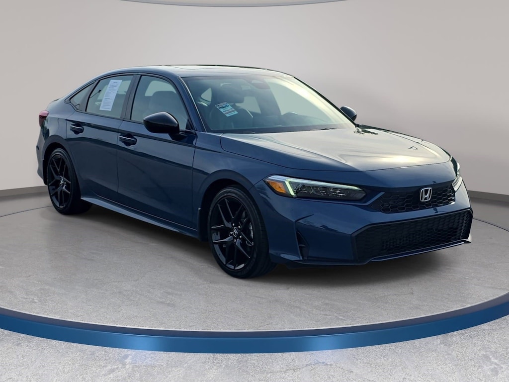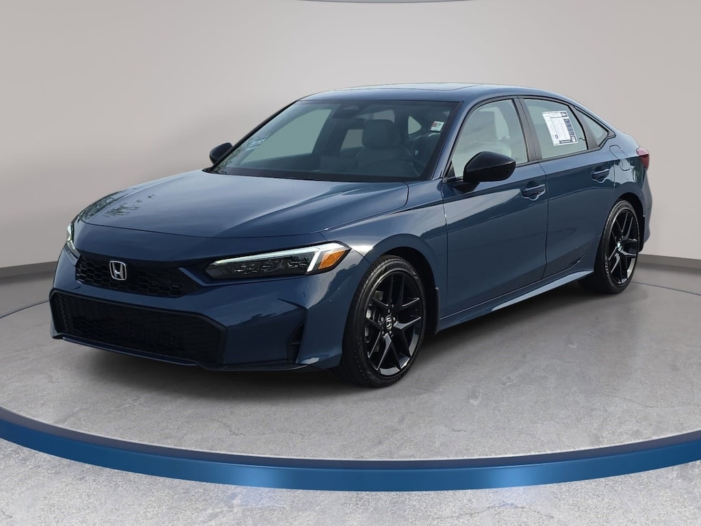 Blue Lagoon Pearl 2025 Honda Civic Hybrid Sport FWD eCVT 2.0L 16V DOHC 2.0L 16V DOHC, 4-Wheel Disc Brakes, 8 Speakers, ABS brakes, Adaptive Cruise Control: Adaptive Cruise Control (ACC) with Low-Speed Follow, Air Conditioning, Alloy wheels, AM/FM radio, Apple CarPlay/Android Auto, Auto High-beam Headlights, Automatic temperature control, Blind Spot Information (BSI) System warning, Brake assist, Bumpers: body-color, Cloth/Leatherette Seat Trim, Delay-off headlights, Dual front impact airbags, Dual front side impact airbags, Electronic Stability Control, Emergency communication system: HondaLink, Exterior Parking Camera Rear, Four wheel independent suspension, Front anti-roll bar, Front Bucket Seats, Front dual zone A/C, Fully automatic headlights, Heated door mirrors, Heated Front Bucket Seats, Heated front seats, Illuminated entry, Knee airbag, Leather Shift Knob, Leather steering wheel, Low tire pressure warning, Occupant sensing airbag, Outside temperature display, Overhead airbag, Panic alarm, Power door mirrors, Power moonroof, Power steering, Power windows, Radio data system, Radio: 180-Watt Audio System, Rear anti-roll bar, Rear side impact airbag, Rear window defroster, Remote keyless entry, Security system, Speed control, Speed-sensing steering, Split folding rear seat, Steering wheel mounted audio controls, Tachometer, Telescoping steering wheel, Tilt steering wheel, Traction control, Trip computer, Variably intermittent wipers, Wheels: 18" Gloss Black Alloy.