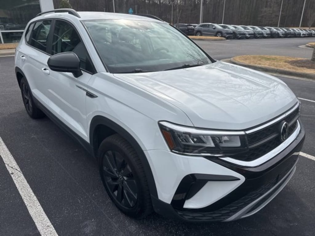 Certified. Pure White 2022 Volkswagen Taos 1.5T S AWD 7-Speed DSG Automatic with Tiptronic 1.5L I4 Turbocharged DOHC 16V LEV3-SULEV30 158hp 17" Silver Alloy Wheels, Active Blind Spot Monitor, Adaptive Cruise Control (ACC) w/Stop & Go, Automatic Rain-Sensing Front Wipers, Electronic Stability Control, Emergency Assist, Exterior Parking Camera Rear, Front Assist, Fully automatic headlights, Hands-On Detection Sensor Steering Wheel, Heated Front Bucket Seats, IQ.DRIVE S Package, Lane Assist (Lane Keeping System), Rear Traffic Alert, S Convenience Package, Travel Assist (Semi-Automated Driving Assistance).
